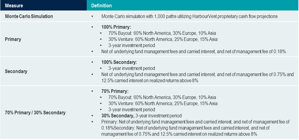 Market simulations are not representative of any investor’s experience.  Simulated results based on the database will be impacted by an uneven representation of funds with different vintage years, sizes, managers, geographic investment focus, and strategies, and a limited pool of investment cash flow data. Capital call and distribution data are based on historic partnership investment cash flows, but do not represent the actual experience of any investor. The actual pace and timing of cash flows is likely to be different and will be highly dependent on the underlying partnerships’ commitment pace, the types of investments made by the fund(s), market conditions, and terms of any relevant management agreements. Market conditions have a significant impact on investments and could materially change the results.  All simulations, projections, and pro forma results are based entirely on the output from numerous mathematical simulations. These simulations are unconstrained by the fund size, market opportunity, and minimum commitment amount, and do not take into account the practical aspects of raising and managing a fund. The simulated hypothetical results should be used solely as a reference to understand certain characteristics of private equity markets and should not be relied upon to manage investments or make investment decisions. Simulated market performance is not indicative of the future returns of any HarbourVest or third party fund or account, and there can be no assurance that future funds or accounts will achieve comparable results. Investments in private funds involve significant risks, including loss of the entire investment.