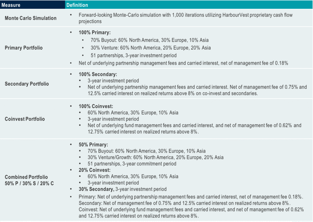 Simulation parameters are subject to change. This presentation contains model portfolios that represent HarbourVest’s current views on portfolio allocation intended to achieve the stated investment objectives. Such model portfolios are designed by HarbourVest personnel who are independent of HarbourVest’s investment teams; however, in constructing model portfolios, HarbourVest professionals may consider input from a variety of sources, including from internal investment professionals, who may have conflicts of interest related to the portfolio construction allocations. These portfolio construction assumptions inform certain market simulations shown herein. Portfolio construction assumptions should not be considered as investment advice or a recommendation of any particular strategy or investment product. Model portfolios presented herein are not tailored to address the investment objectives of any specific client. There is no guarantee that the model portfolio construction assumptions will work under all market conditions or will result in portfolios suitable for all investors. HarbourVest may change its view on portfolio allocations without notice and makes no representation that market simulations will be updated. No representation is being made that any model portfolio will or is likely to achieve profits, losses or results similar to those shown.
